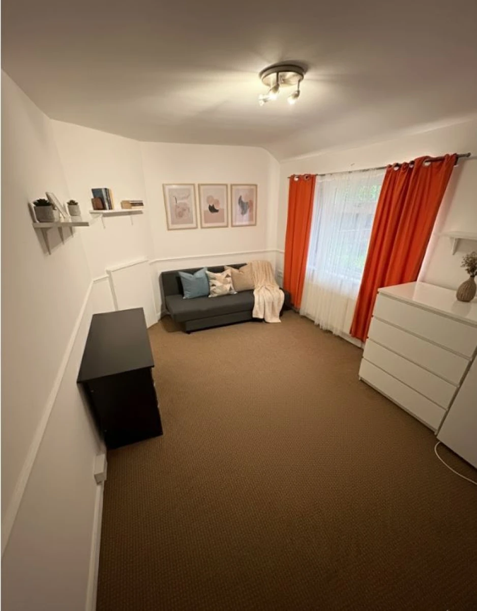 Do wynajęcia przestronny i wygodny pokój wyposażony w biurko, własną lodówkę, podwójne łóżko-sofę oraz duże zabudowane szafy. Dom jest spokojny i regularnie sprzątany.