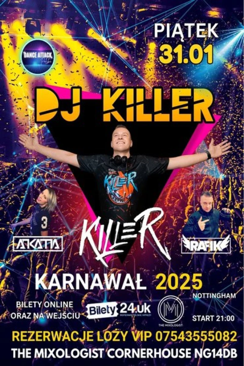 Piątek 31 stycznia przygotujcie się na mega muzyczny armagedon przy najlepszych klubowych utworach muzyki EDM, VIXA, TECHNO, RETRO DANCE Najgłośniejsza impreza Karnawałowa w okolicy na której wystąpi gwiazda wieczoru! JEDEN Z NAJPOPULARNIEJSZYCH DJów w POLSCE ★ DJ KILLER ★ www.facebook.com/DjKillerPL BILETY DOSTĘPNE ONLINE NA WWW.BILETY24.UK W CENIE £15 ORAZ NA WEJŚCIU W DNIU IMPREZY W CENIE £20 REZERWACJE LOZY VIP POD NR. 07543555082 w cenie: sama loża £40 lub loża z butelką wódki lub Jacka Dannielsa £140 (ilość ograniczona) KUPUJAC LOŻE BIERZESZ UDZIAŁ W LOSOWANIU BUTELKI WÓDKI “BELVEDERE” WRAZ Z MIXERAMI! www.bilety24.uk/pl/-karnawal-2025-dj-killer-w-nottingham-31.01-2297.p.html/