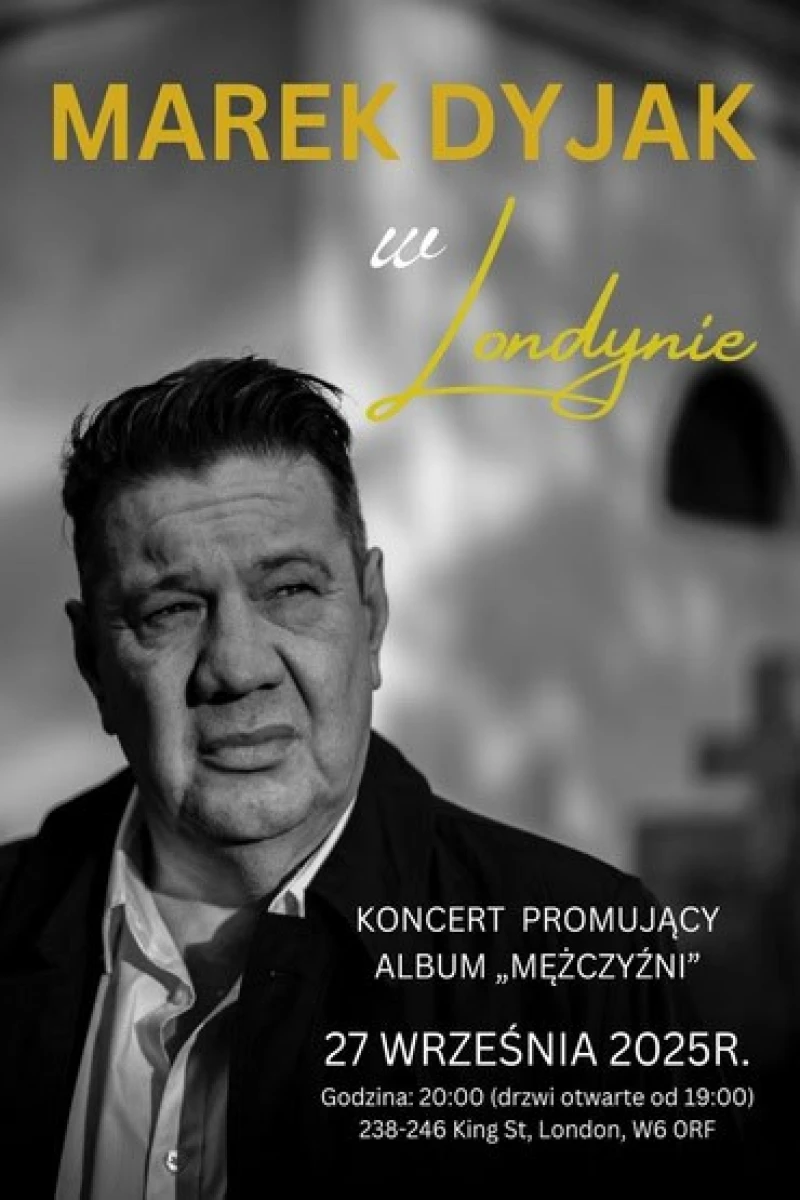 Już 27 września 2025 roku w Londynie wystąpi – Marek Dyjak! Charyzmatyczny wokalista, znany ze swojego niezwykle ekspresyjnego głosu i emocjonalnych interpretacji, zaprezentuje utwory ze swojej najnowszej płyty “Mężczyźni”, a także dobrze znane kompozycje, które przez lata podbiły serca fanów.